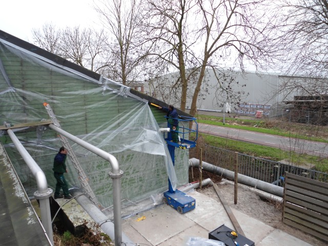 Opdrachtgever: van Kessel bouw. Werkzaamheden: Saneren van asbesthoudende golfplaten en de schoonmaak van het daaronder gelegen gedeelte van de loods van Sonac Vuren.
